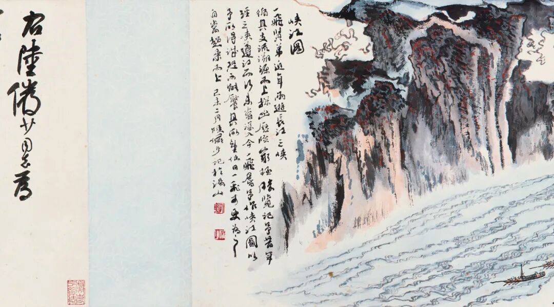 题跋:右陆俨少同志为一飞同志所写峡江图。俨少当年曾自蜀溯江而下,亲历江山之胜,屡见其所作峡江图,无不精妙,情与境之不可分如此。己未夏,稚柳题。钤印:稚柳、谢