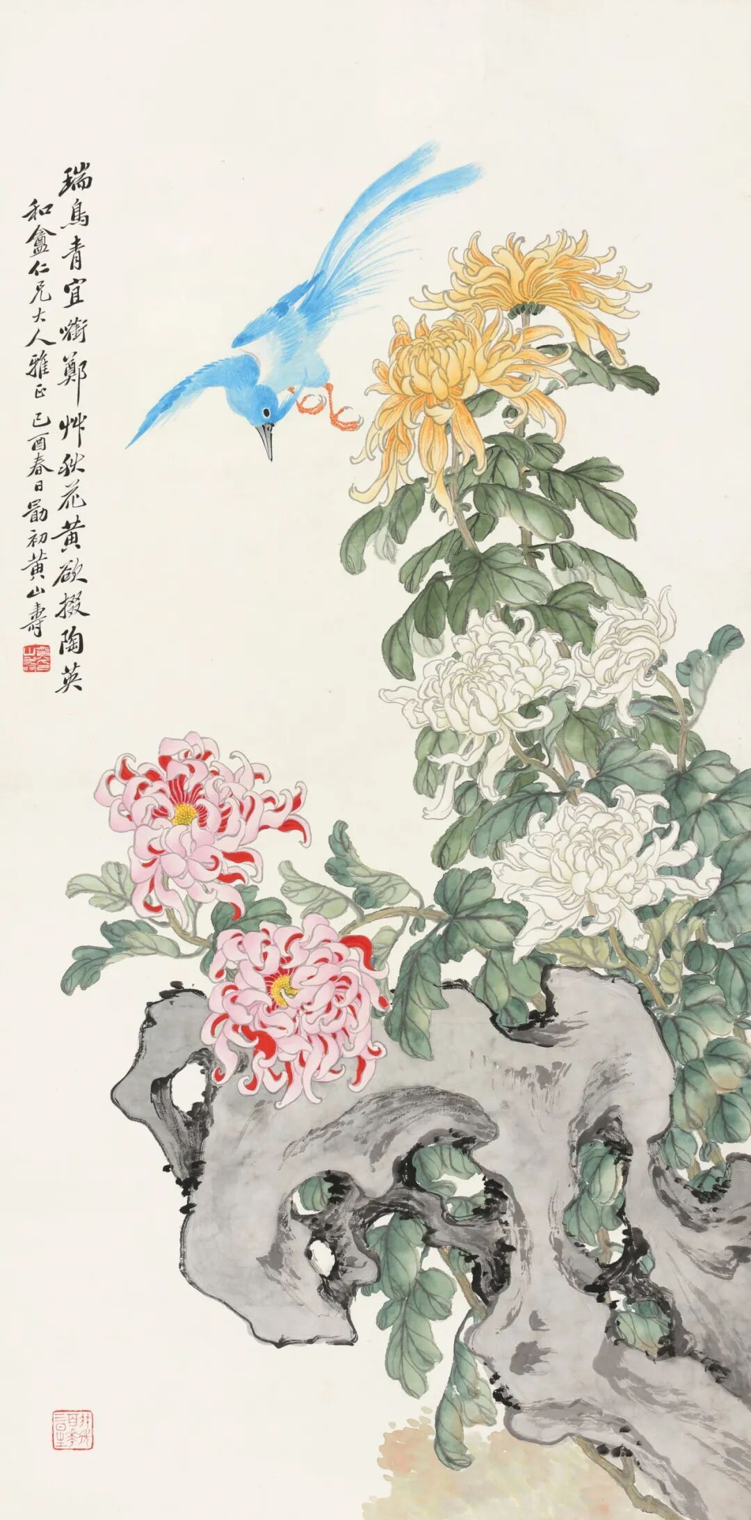 题识:瑞鸟青宜衔郑草,秋花黄欲掇陶英。和盦仁兄大人雅正,己酉春日,勖初黄山寿。