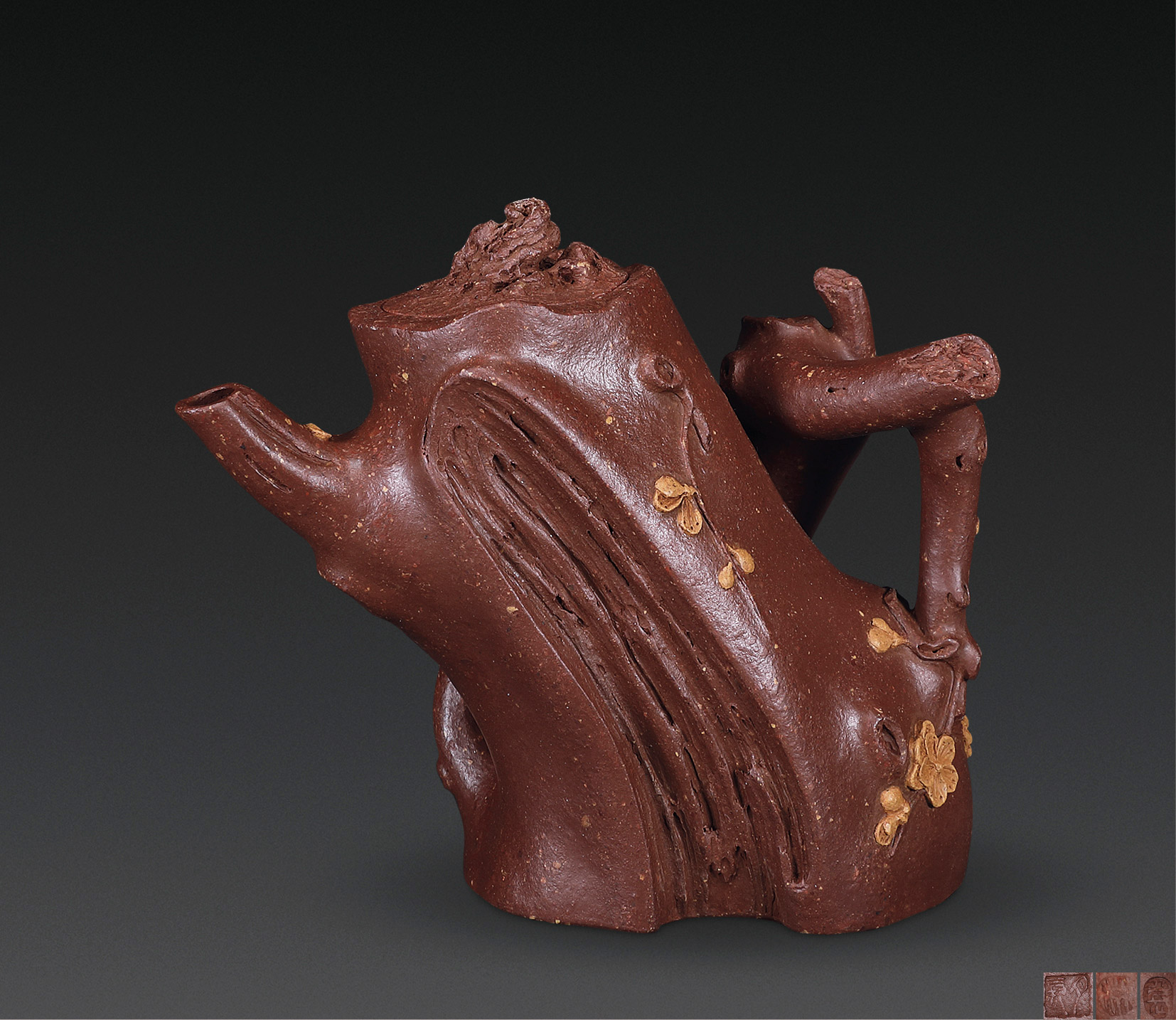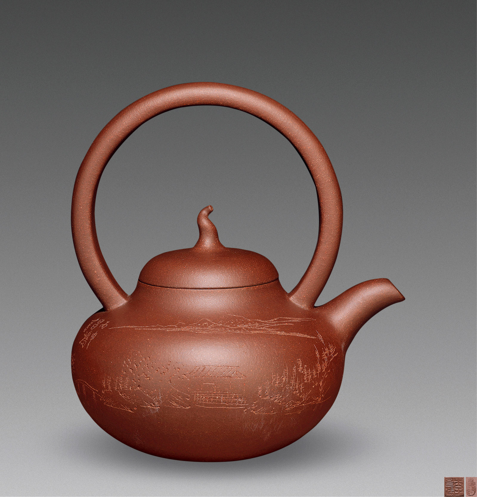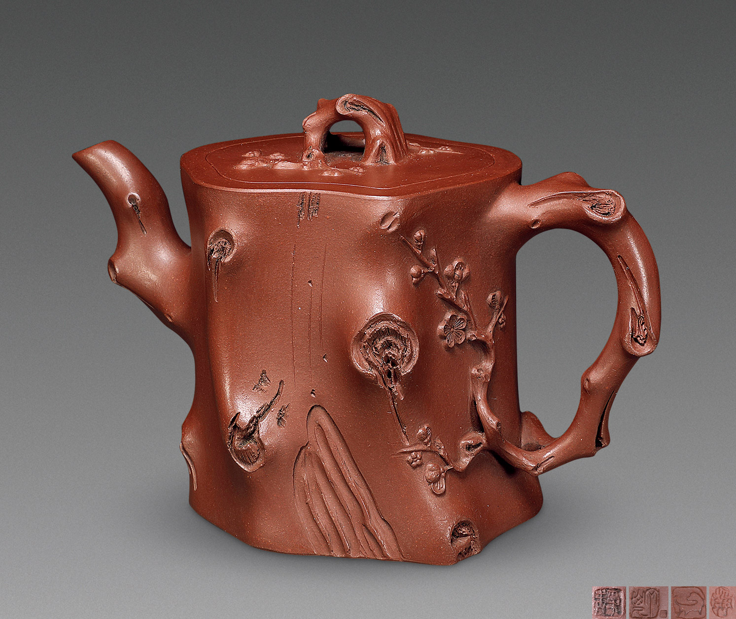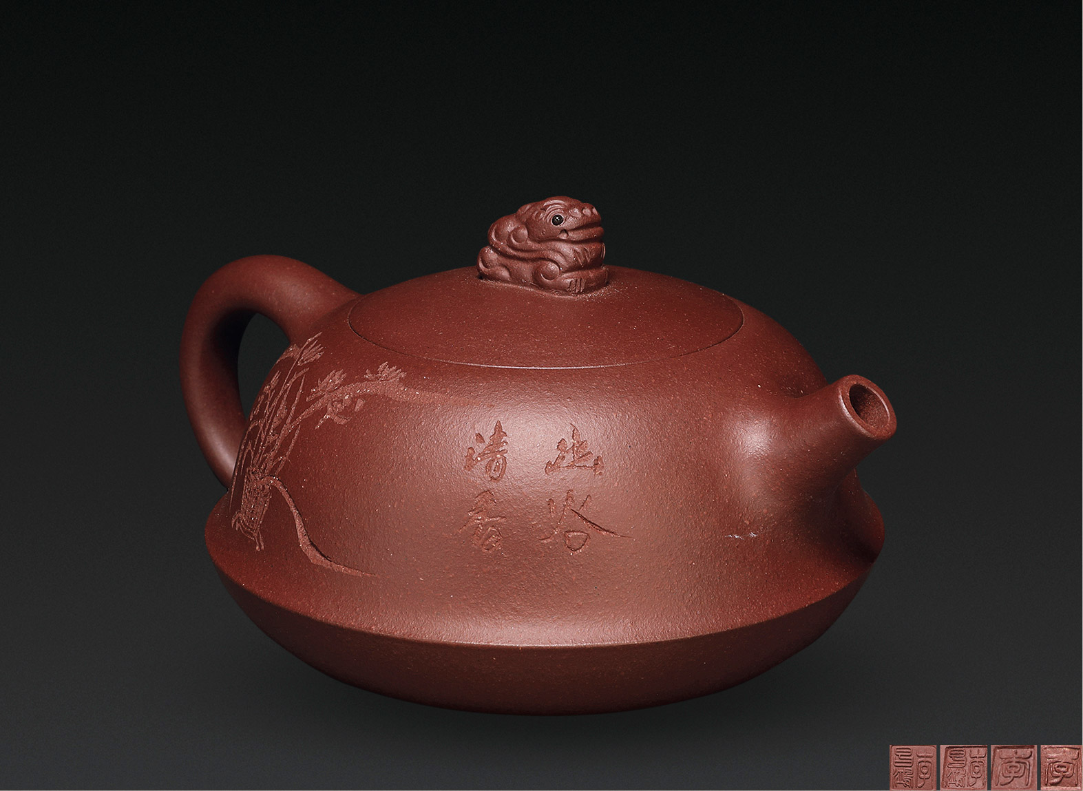 Lot 1020 谢稚柳绘 陈佩秋题 谢定琨监制 王康制“喜上枝头”将军壶、“傲雪含香”西施壶、“湖山秋亭”德钟壶、“读书品茗”石瓢壶(一套四把)