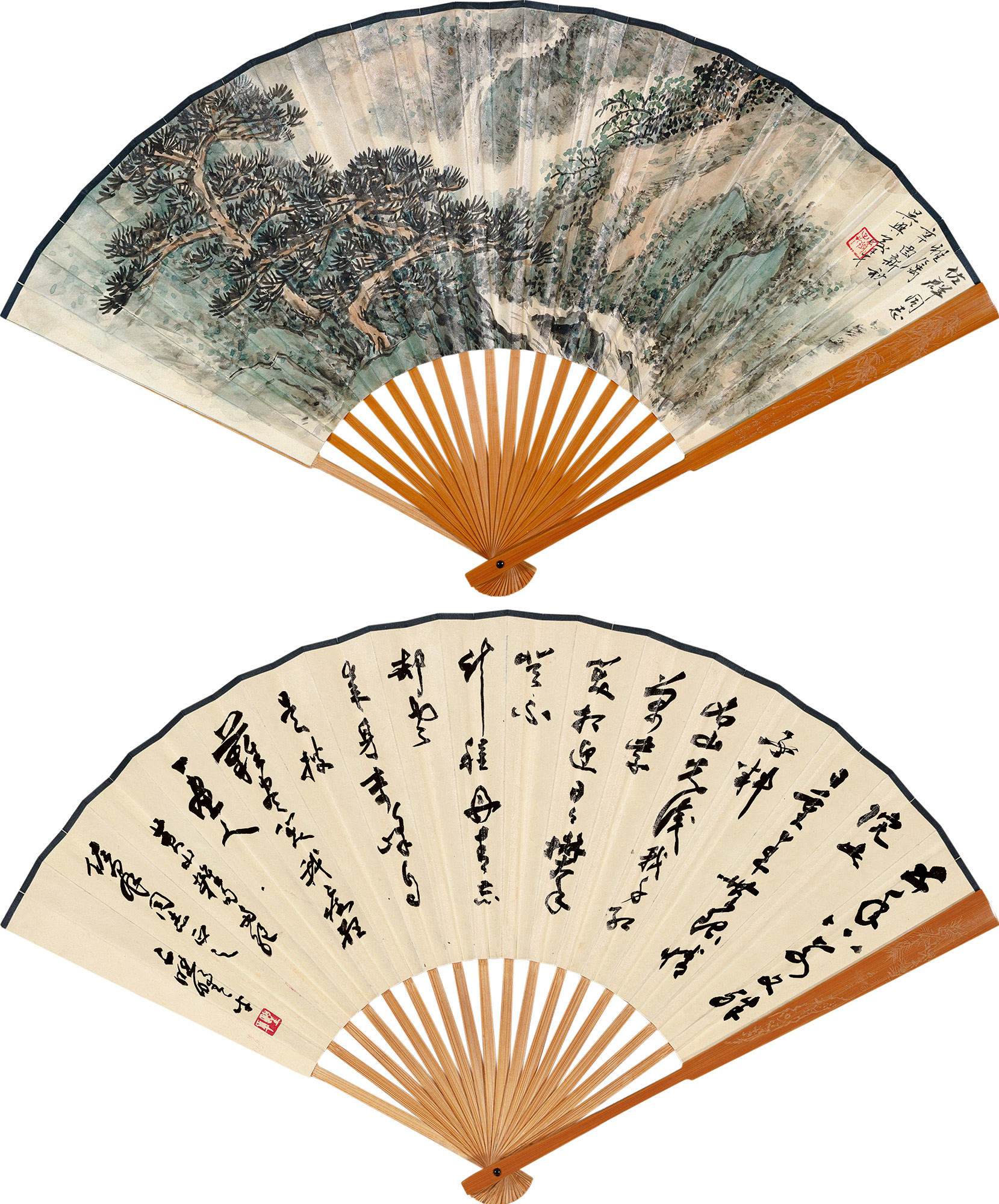 Lot 133 1981年作 松荫流涧 行书 成扇 设色纸本