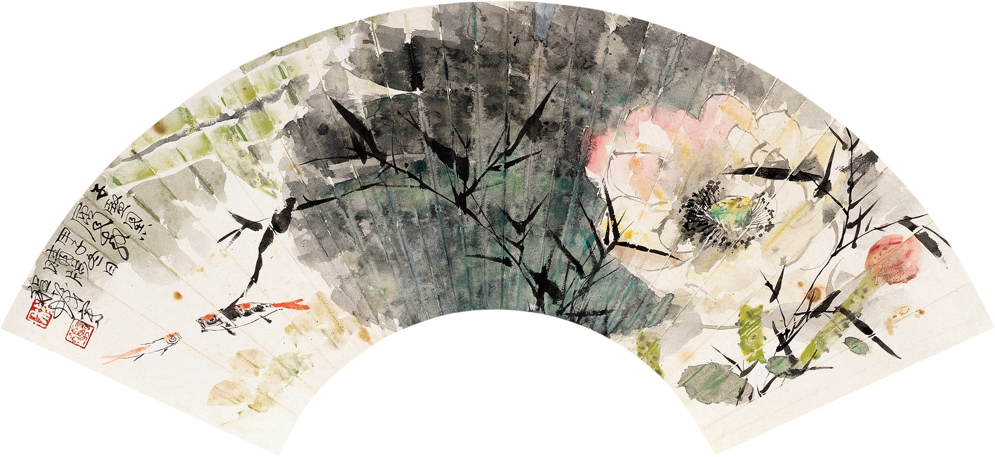 Lot 493 1984年作 荷花游鱼 扇片 设色纸本