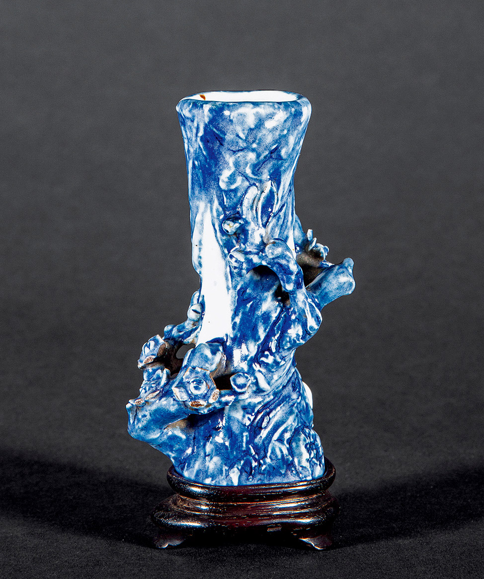 Lot 1066 清乾隆 青花树桩花插(原配紫檀底座)