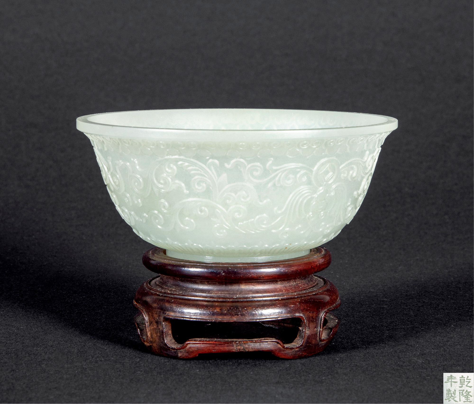 Lot 1079 乾隆 西番莲白玉碗(配老红木座)