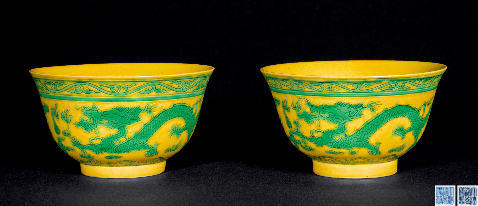Lot 1072 清道光 黄地绿龙寿字碗 (一对)
