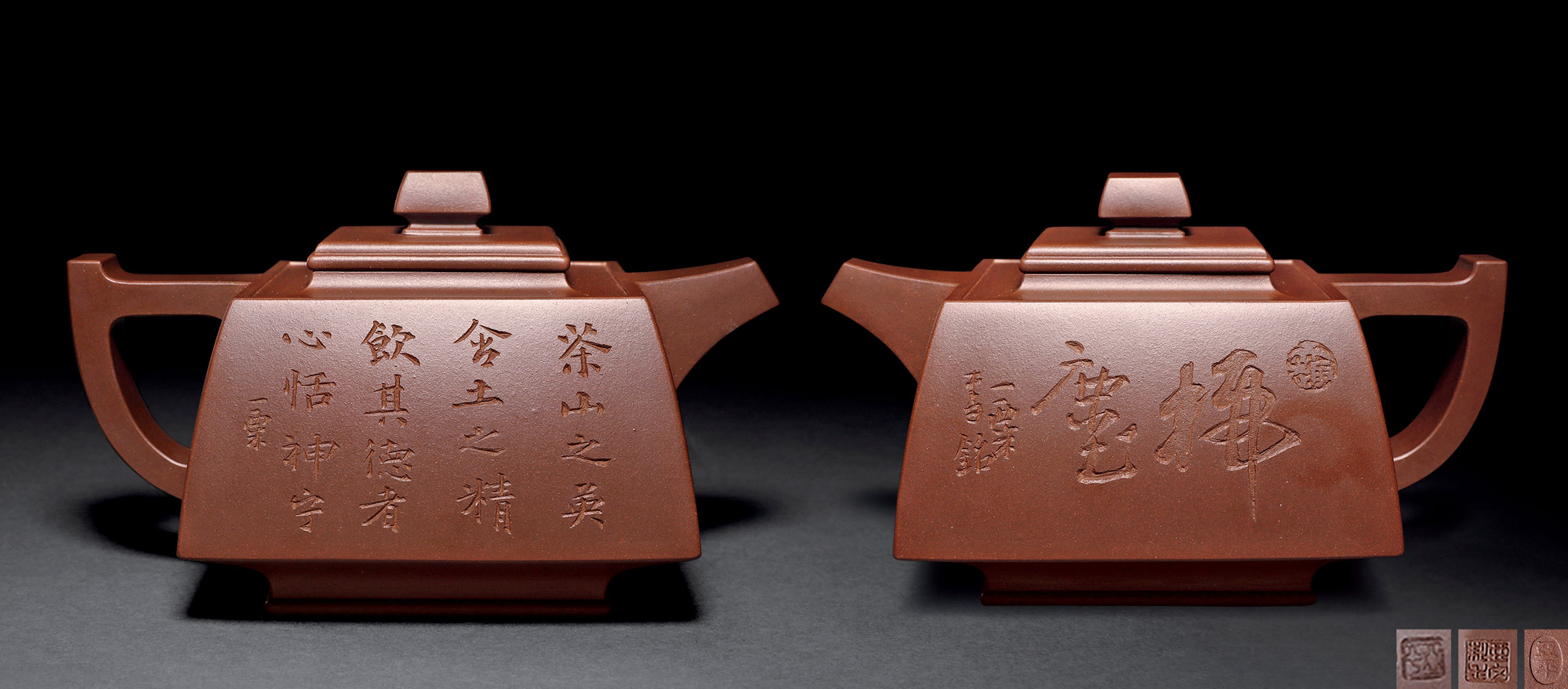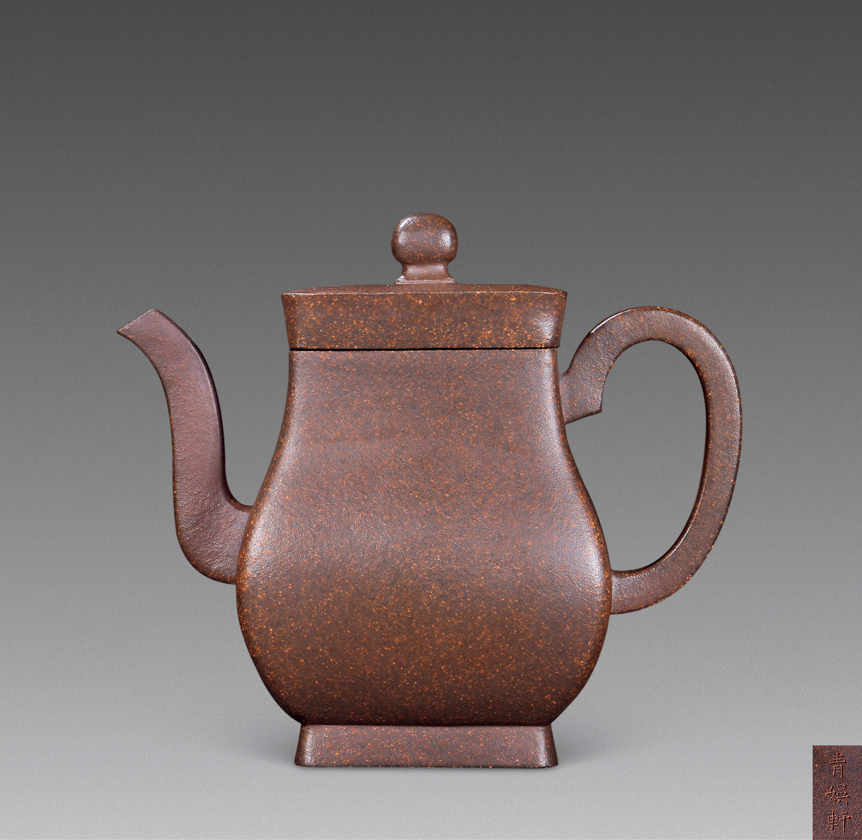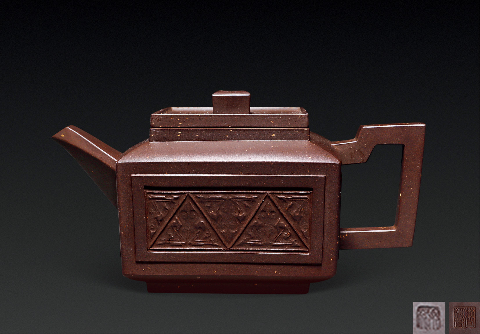 Lot 773 当代 杨全胜制 大红袍朱泥 古梨式方壶