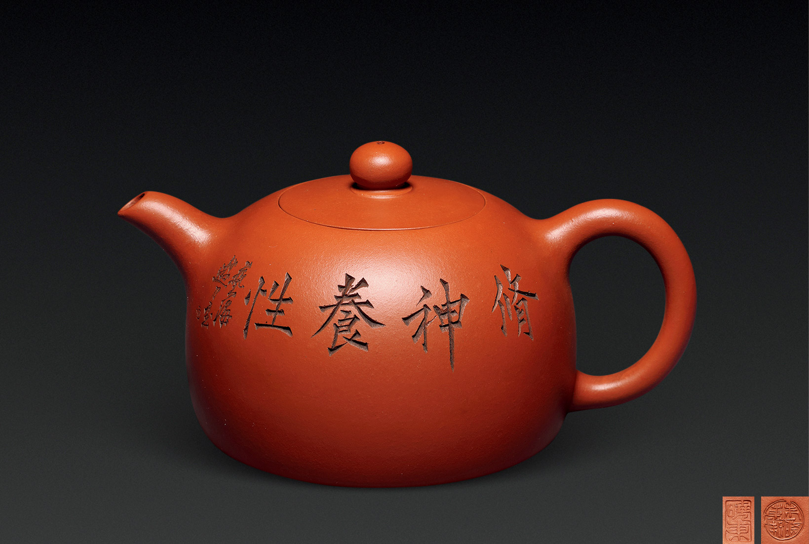 Lot 777 当代 朱晓东制 艺海游刀铭 红泥秋色壶