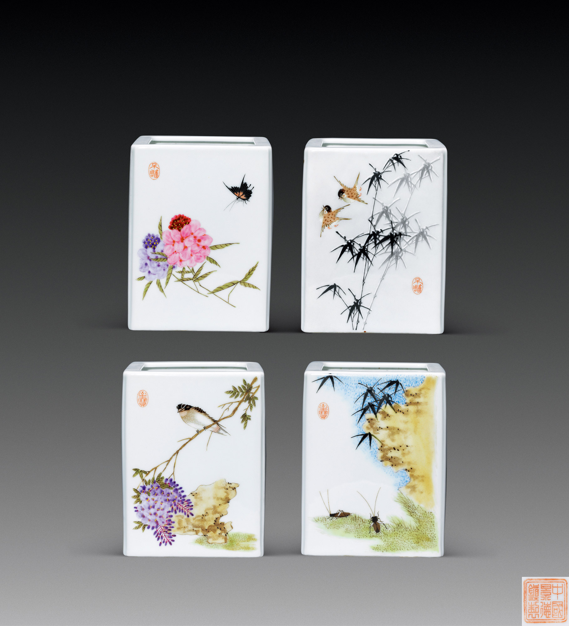 Lot 1028 粉彩 四季花鸟四方笔筒